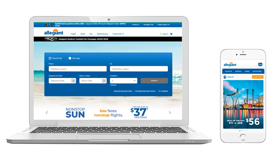 Allegiant Travel Company wanted to create a new responsive website to improve its brand image, reduce friction while purchasing travel, and increase conversions. Allegiant was ready for a change in brand identity to better reflect its investments in onboard and airport upgrades.